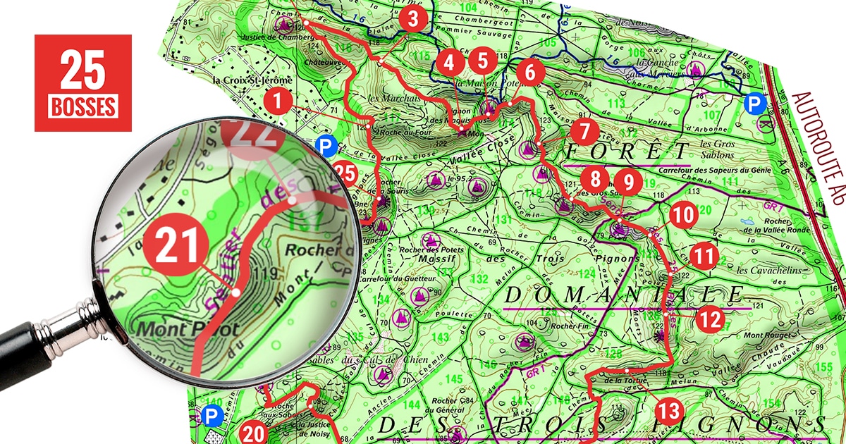 Le circuit des 25 bosses est sans aucun doute le terrain de jeu préféré des coureurs ou des randonneurs parisiens qui souhaitent s'entraîner à quelques kilomètres de chez eux. Situé dans le massif des 3 pignons au coeur de la forêt de Fontainebleau, ce sentier de randonnée se trouve à moins d'une heure au sud de Paris. Malgré le fait qu'il ne soit pas situé en montagne, il n'en est pas moins être une randonnée difficile : cette boucle de 14 km et 800m de dénivelé positif ne paye pas de mine mais reste très technique, elle n'a rien à envier au GR20 ! Voici le topo et la carte IGN du circuit des 25 bosses !